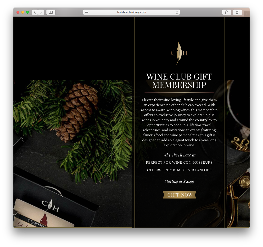 Create a theme for Cooper’s Hawk 2017 Holiday Miscrosite that promotes products, gift sets, and memberships.